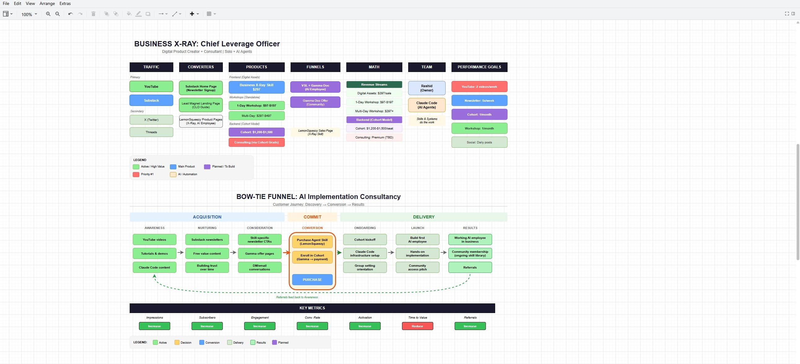 Your entire operation on one screen. How people find you, how they become customers, and what happens after they pay. The bow-tie shows the complete customer journey from stranger to repeat buyer.
